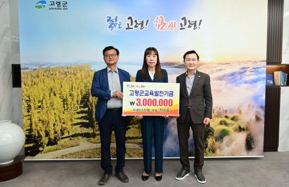 ㈜하나산림에서 4월 15일 고령군청을 방문하여 지역의 교육 발전과 인재 양성을 위해 사용해 달라며 교육발전기금 300만원을 기탁했다.이날 기탁식에 참석한 ㈜하나산림 대표 전미옥은 “지역의 우수한 인재를 키우는 밑거름이 되길 바라는 마음에서 교육발전기금을 기탁하게 됐다”며 “앞으로도 지역 발전과 인재 양성을 위해 ㈜하나산림이 지속적으로 힘을 보탤 수 있도록 하겠다”고 말했다.고령군은 지역교육 활성화를 위하여 선뜻 큰 금액을 기탁한 ㈜하나산림 전미옥 대표께 고마움을 표하고 “지역 학생들을 생각해 주시는 마음에 정말 감사드린다”며 “새로운 교육프로그램 개발과 지역인재 육성을 위해 최선을 다하겠다”고 답했다.
