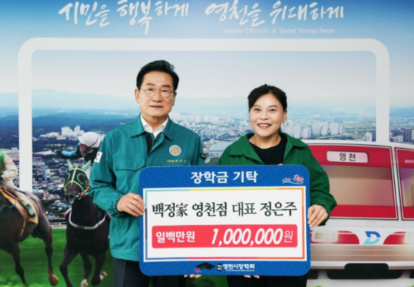 정은주 백정家 영천점 대표는 지난 16일 100만원의 장학금을 영천시장학회에 기탁했다.완산동에서 육고기 전문식당 ‘백정家’를 운영하고 있는 정은주 대표는 평소 소외된 이웃에 나눔을 실천하며, 특히 어려운 환경에서 학업에 매진하는 학생들에게 꾸준한 관심을 가져왔다. 정 대표는 지역에서 나고 자라 세 자녀를 키우며 교육의 중요성을 깊이 체감하게 됐고, 첫째 자녀가 중학교 입학 시 성적우수 장학금을 받았던 경험을 바탕으로 장학금 기탁을 결심했다고 전했다.정 대표는 “지역에서 받은 사랑을 나눔으로 보답할 수 있어 영광이고, 어려운 학생들에게 조금이나마 도움이 되기를 바라는 마음으로 기탁하게 됐다”고 소감을 전했다.최기문 이사장은 “지역에서 받은 사랑과 나눔을 잊지 않고, 따뜻한 마음으로 다시 나눔을 실천해 주셔서 깊이 감사드린다”며, “앞으로도 학생들을 위한 장학사업 추진을 통해 영천을 빛낼 인재를 양성하는 데 최선을 다하겠다”고 감사 인사를 전했다.