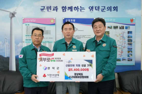 경상북도시군의회의장협의회가 4월 21일부터 30일까지 경북 산불 피해지역 5개 시·군(안동·의성·청송·영양·영덕)을 방문하여 피해 복구를 위한 성금 2,700만원을 전달한다.이번 성금 전달은 극심한 산불 피해로 삶의 터전을 잃은 주민들이 하루빨리 안정을 되찾고 일상에 복귀할 수 있도록 지원하기 위한 것으로, 피해지역을 제외한 경북 17개 시·군의회 의장이 5개 조로 나누어 산불이 발생한 5개 시·군의 의회를 방문하고 각 540만원의 성금을 전달할 예정이다.21일 울릉군의회 의장과 함께 영덕군의회를 방문한 경주시의회 이동협 의장은 “경북 모든 시·군의회가 한마음으로 산불피해가 조속히 회복되기를 염원하고 있으며, 이번 성금이 피해 주민들에게 조금이나마 도움이 되기를 바란다”고 전하며, “산불 피해를 위해 물품을 기부하거나 성금을 전달해주시는 많은 분들에게도 감사의 말씀을 드리며, 앞으로도 지속적인 관심을 부탁드린다”고 당부했다.
