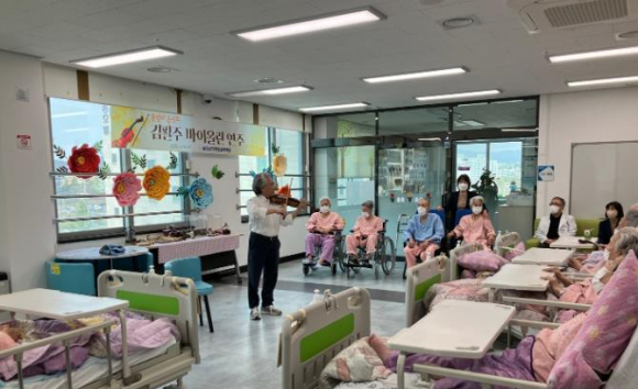 울진군의료원요양병원은 지난 4월 16일 환자와 직원 등 30여 명이 참석한 가운데 김필주 바이올리니스트를 초청해 봄맞이 작은 음악회를 개최했다. 현재 경기문화재단 이사를 역임하고 있는 김필주 바이올리니스트는 1968년, 미국과 캐나다, 버뮤다 등 120여 도시에서 독주회를 시작으로 국내외 교향악단 악장으로 총 1000여 회 이상의 공식적인 오케스트라 연주를 이끌었으며, 지금은 우리나라 각 지를 돌며 바이올린 연주봉사를 하고 있는 중이다. 연주 시작 전 연주할 곡에 대한 재미있는 배경 설명으로 연주에 더 깊게 빠져 들 수 있도록 도왔다. ‘타이스명상곡’, ‘백조’,‘사랑의 슬픔’, ‘동심초’등 귀에 익숙한 선율이 병동에 울려 퍼졌고, 곡이 끝날 때마다 박수와 환호로 화답했다. 울진군의료원요양병원은 치매환자지원프로그램을 운영하고 있다. 오늘 이 연주회도 치매환자 직접 치료 외에, 치료에 도움을 주거나 치료 후 상태악화 방지 등 전반적인 의료관리 강화, 비약물치료프로그램 일환으로 마련됐다. 한편, 울진군의료원요양병원은 앞으로도 이러한 문화 프로그램을 지속적으로 마련하여 환자들에게 풍요로운 경험과 치유의 시간을 제공할 예정이다. 조영래 원장은“장기치료가 불가피한 요양병원에서 지루함을 잊을 수 있는 소중한 시간이었다”며“오늘 뜨거운 호응과 함께 기쁘게 참여해주신 환자분께 감사드리며 하루빨리 회복되시길 바란다”라고 전했다.