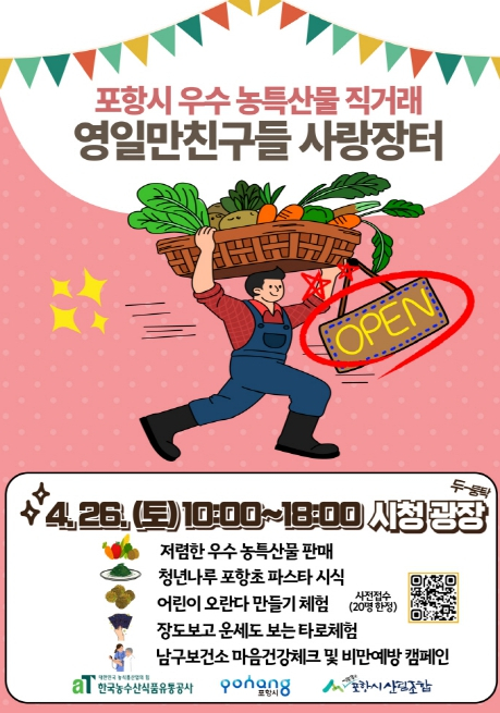 포항시는 오는 26일 시청광장에서 포항시 우수 농특산물 정례 직거래장터인 ‘영일만친구들 사랑장터’를 개장한다. 올해 사랑장터는 포항시와 포항시산림조합이 농림축산식품부와 한국농수산식품유통공사(aT)가 주관하는 ‘정례형 직거래장터 지원사업’ 공모에 선정돼 이와 연계해 운영된다. 장터에는 지역 35개 농가가 참여해 26일부터 11월 15일까지 매주 토요일 오전 10시부터 오후 6시까지 시청광장에서 열린다. 꿀, 채소, 과일, 장류 등 다양하고 질 좋은 지역 농특산물을 시중가보다 저렴한 가격에 만날 수 있다. 특히 개장일에는 ▲포항초 파스타 시식 행사 ▲타로 및 어린이 체험 ▲보건소 마음 건강 체크 및 비만 예방 캠페인 등 시민과 가족이 함께 즐길 수 있는 부대행사와 특별 할인 행사도 마련된다. 이현주 포항시 농업기술센터소장은 “직거래 장터는 지역 농가의 판로 확대와 소득 증대에 도움을 줄 뿐 아니라, 시민들에게는 신선하고 믿을 수 있는 먹거리를 합리적인 가격에 구입할 수 있는 좋은 기회”라며, “많은 시민들이 장터를 찾아주시길 바란다”고 말했다.
