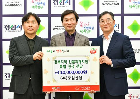 경산시 진량읍 소재 (주)중원산업은 18일 경산시청을 방문하여 최근 대규모 산불로 피해를 입은 이재민들을 돕기 위해 성금 1,000만원을 기탁했다.김명구 대표이사는“기업이 잘 성장하는 만큼, 어려운 시기에 따뜻한 손길을 내밀 수 있는 것도 중요한 기업의 책임이다”며“우리의 나눔이 산불피해 이재민들에게 희망을 주는 큰 힘이 될 수 있기를 바란다” 고 전했다.조현일 경산시장은“중원산업의 따뜻한 나눔에 감사드리며 기탁하신 성금은 피해 주민들이 하루빨리 일상으로 돌아갈 수 있도록 소중히 사용 될 것이며 신속하게 경북사회복지공동모금회에 잘 전달하겠다”고 답했다.한편, ㈜중원산업은 자동차 부품용 냉간단조 및 와이어밴딩 전문 생산기업으로, 끊임없이 혁신과 품질을 추구하고 있으며 기술적 우수성을 넘어 기업의 사회적 책임을 다하는 데도 앞장 서고 있다.