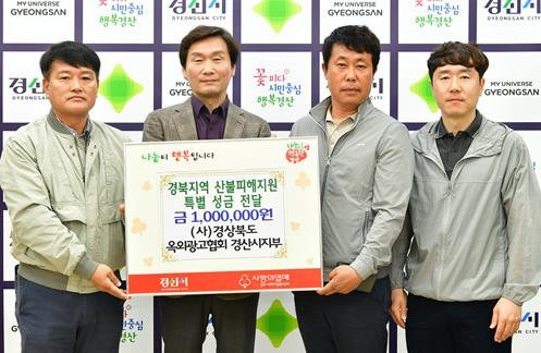 (사)경상북도 옥외광고협회 경산시지부는 18일 경산시청을 방문하여 최근 산불로 삶의 터전을 잃고 어려움을 겪고 있는 이웃들을 돕기 위해 성금 100만원을 기탁했다.원윤희 지부장은“산불 피해로 힘든 시기를 겪고 있을 이재민들에게 작은 위로라도 되기를 바라는 마음에 정성을 모으게 됐다”며 ˝하루 빨리 피해가 복구되고 주민들이 일상으로 돌아갈 수 있기를 바란다”고 말했다. 조현일 경산시장은“어려운 시기임에도 불구하고 어려운 이웃을 위해 따뜻한 나눔을 실천해주신 지부장님과 회원분들게 진심으로 감사드리며 성금은 피해 주민들의 복구와 생활 안정을 위해 경북 사회복지공동모금회로 소중히 잘 전달하겠다” 고 말했다..