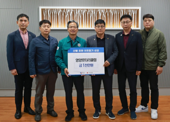 국제로타리 3630지구 영양로타리클럽(회장 김종호)은 최근 발생한 산불로 큰 피해를 입은 영양군 지역 주민들을 지원하기 위해 성금 1,000만원을 영양군청에 전달했다. 이번 성금은 산불 피해로 어려움을 겪고 있는 이재민들의 생활 안정과 신속한 복구 지원을 위해 마련됐으며, 영양로타리클럽 회원들의 자발적인 모금으로 조성됐다. 성금 전달식은 영양군청에서 진행됐으며, 이 자리에는 오도창 군수를 비롯한 관계자들과 영양로타리클럽 임원진이 참석했다. 김종호 회장은 ˝작은 정성이지만 산불 피해를 입은 군민 여러분께 힘이 되기를 바란다˝며, ˝앞으로도 지역사회에 힘이 되는 다양한 봉사 활동을 이어가겠다˝고 밝혔다. 오도창 군수는 ˝영양로타리클럽의 따뜻한 마음에 깊이 감사드린다˝며, ˝성금은 피해 주민들의 일상 회복을 위해 소중히 사용하겠다˝고 감사의 뜻을 전했다. 영양로타리클럽은 이번 산불에 성금 기탁뿐만 아니라 산불진화 현장에 몸소 나서는 등 지역사회의 큰 귀감이 되고 있다.