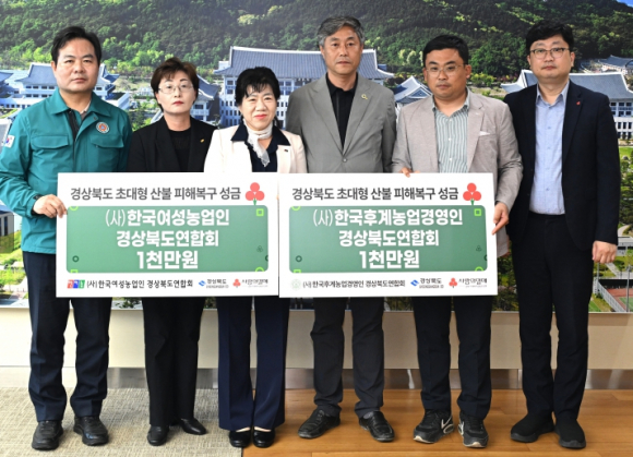 한국후계농업경영인 경상북도 연합회와 한국여성농업인 경상북도 연합회가 21일 경북도청을 방문해 산불 피해복구를 위한 성금 2,000만원(한농연 1,000만원, 한여농 1,000만원)을 전달했다. 이날 성금은 초대형 산불로 큰 피해를 본 경북 북부지역 의성, 안동, 청송, 영양, 영덕 등 5개 시군의 주민을 지원하기 위해 한국후계농업경영인·한국여성농업인 경상북도 연합회 회원들이 마음을 모아 마련했으며, 경북사회복지공동모금회를 통해 재해복구 사업과 이재민 지원에 사용될 예정이다.농업인들을 대표하는 두 단체는 평소에도 주변 도움이 필요한 이웃들에 봉사해 사회 공익에 기여하고 있으며, 이번 산불 피해 이외에도 수해 피해, 태풍 피해, 저출생 극복 등 지역사회 위기 극복과 발전에 앞장서고 있다. 송종만 한국후계농업경영인 도연합회장과 김수미 한국여성농업인 도연합회장은 “예기치 못한 자연재해로 큰 피해를 본 지역 주민들께 깊은 위로의 말씀을 전한다. 우리가 함께 모은 이 정성이 꼭 필요한 곳에 도움이 되기를 바란다”라고 전했다.김학홍 행정부지사는 “경상북도 농업인 여러분의 따뜻한 마음에 진심으로 감사드리며, 산불 피해 신속한 복구를 통해 안정적인 일상이 될 수 있도록 모든 지원을 아끼지 않겠다.”라고 말했다.
