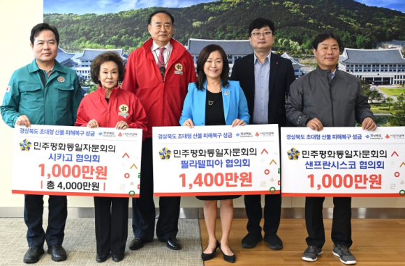 민주평화통일자문회의 필라델피아·샌프란시스코·시카고 협의회(이하‘미주 평통’)가 12일 경북도청을 방문해 경북 지역 초대형 산불 피해 복구를 위한 성금 3,400만원을 전달했다. 이번 성금은 필라델피아 1,400만원, 샌프란시스코 1,000만원, 시카고 1,000만원 등 미국 내 주요 평통 협의회들이 자발적으로 모금한 것으로, 경북사회복지공동모금회를 통해 재해 복구와 이재민 지원에 사용될 예정이다.이번 성금 전달은 15일 시카고 협의회가 성금 3,000만원을 전달한 데 이어, 필라델피아 협의회와 샌프란시스코 협의회, 시카고 협의회가 잇따라 성금을 모아 공동으로 전달하게 됐다.또한, 오는 25일에는 뉴욕협의회가 성금을 추가 전달할 예정이다. 경북 초대형 산불에 대해 미주 한인사회의 지속적인 관심과 연대가 이어지고 있다. 성금 전달식에서는 전체 모금 캠페인을 총괄한 진안순 민주평통 글로벌전략 특별위원회 위원장과 함께 김길영 시카고 협의회장, 이주향 필라델피아 협의회장, 이동영 샌프란시스코 대외협력분과 위원장이 참석했다.진안순 위원장은“이번 성금은 미주 한인사회 전체가 조국과 함께한다는 의지의 표현이다. 총괄 모금 위원장이자 경북도 해외 자문위원으로서 각 지역 협의회와 긴밀히 협력하며 성금 모금을 추진했고, 앞으로도 모국의 어려움에 함께 하는 공동체가 되겠다”고 강조했다.김학홍 경상북도 행정부지사는 “미주 각 지역 민주평통 협의회의 따뜻한 마음에 깊이 감사드리며, 성금은 신속한 복구와 이재민 지원에 귀중히 사용하겠다. 세계 곳곳에서 응원과 지원을 보내주시는 교민 여러분이 피해 주민들에게 큰 위로와 희망이 되고 있다”고 했다.