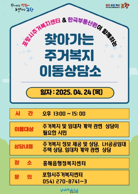 포항시가 시민의 주거 고민을 한층 더 가까이에서 해결하기 위해 나선다. 오는 24일부터 포항시는 ‘찾아가는 주거복지 이동상담소’를 열고 시민들이 실제로 생활하는 현장에서 맞춤형 상담을 제공할 예정이다. 이번 이동상담소는 포항시 주거복지센터와 한국부동산원 포항지사가 함께 운영하며, 주거 문제로 어려움을 겪는 시민들을 직접 찾아간다. 특히 주거취약계층, 청년, 신혼부부 등 도움이 꼭 필요한 시민들에게 실질적인 정보를 전달하고, 주거복지 사업을 연계해주는 것이 핵심이다. 첫 일정은 24일 흥해읍행정복지센터에서 시작된다. 이후 상가 내 쪽방, 여인숙, 모텔 등 비정상 거처 밀집 지역과 청년 및 신혼부부 등 수요가 많은 10개 읍면동 행정복지센터를 순회하며 진행된다. 현장에서는 ▲주거복지 관련 지원 사업 ▲주거 취약계층 주거 상향 지원 사업 ▲LH 공공임대주택 정보 ▲임대차계약 분쟁 상담 등 생활과 밀접한 주거 고민에 대한 상담이 이뤄진다. 특히 이번 이동상담소 운영은 비정상거처에서 벗어나 더 나은 주거환경으로 이사하고 싶지만 방법을 몰라 막막했던 시민, 임대차계약 때문에 고민이 많은 청년이나 신혼부부에게 실질적인 도움이 될 것으로 기대되고 있다. 포항시 관계자는 “현장을 찾아가는 주거복지 서비스로 주거취약계층의 접근성을 높이고, 실질적인 도움을 줄 수 있도록 노력하겠다”며 “올해 1월 정식 개소한 포항시 주거복지센터가 시민에게 꼭 필요한 역할을 할 수 있도록 적극적으로 운영해 나가겠다”고 말했다. 보다 자세한 일정과 상담 문의는 포항시 주거복지센터로 하면 된다.
