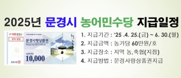 문경시는 오는 4월 25일부터 6월 30일까지 2025년 문경시 농어민수당을 지역 농·축협(지점)을 통해 문경사랑상품권으로 지급한다고 밝혔다.올해 문경시 농어민수당은 지역농업과 농촌의 공익적 가치를 존중하고 농어업인들의 자긍심을 높이기 위해 9,960호 농가에 60만 원씩 총 59억여 원을 지급한다.대상 농가는 수당을 수령할 지역 농·축협(지점)을 방문해 본인 확인을 거쳐 농어민수당을 문경사랑상품권으로 수령할 수 있으며, 대상자가 입원 등 불가피한 사유로 수당을 직접 받기 어려운 경우에는 주소지 읍면동 행정복지센터에서 확인을 받아 대리 수령도 가능하다.이번에 지급되는 문경사랑상품권은 정책발행분으로 일반 가맹점 및 연 매출액 30억 원을 초과하는 사업장(농협 마트, 일부 주유소 등)에서도 사용이 가능하다. 이를 통해 농가들이 필수 영농자재와 생활필수품을 구매할 수 있어 전통시장과 소상공인들의 경제적 안정에도 큰 도움이 될 것으로 기대된다.신현국 문경시장은 “농어민수당 지급을 통해 농산물 가격 하락, 농자재 가격 인상 등 어려움에 처해 있는 농업인들에게 조금이나마 도움이 되길 바라고, 아울러 지역경제 활성화와 생활안정에도 보탬이 되길 바란다.”라고 밝혔다.