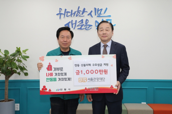 서울관광재단(대표이사 길기연)은 4월 17일 안동시를 직접 방문해 대형산불로 큰 피해를 입은 이재민들을 돕기 위한 기부금 2,012만 원을 전달했다.이번 기부금에는 서울관광재단의 성금 1천만 원을 비롯해 서울관광재단 임직원 100여 명이 고향사랑기부제를 통해 자발적으로 모금한 1,012만 원이 포함돼 더욱 의미가 깊다.더불어, 지역 관광산업의 회복을 위한 안동시-서울시 관광·MICE 분야 협력 방안에 대한 논의도 진행했다.길기연 대표이사는 “이번 기부가 산불로 삶의 터전을 잃은 피해 주민들에게 작게나마 위로와 희망이 되길 바라며, 앞으로 안동시와 함께 지역 상생협력을 통한 지역관광 활성화에 노력하겠다”고 전했다.권기창 안동시장은 “안동의 어려움을 나누기 위해 직접 방문해 기부해주신 서울관광재단 길기연 대표이사님과 관계자 여러분께 깊은 감사의 말씀을 드린다”며 “전달된 성금은 이재민들이 하루빨리 일상으로 돌아갈 수 있도록 피해복구 지원에 소중히 사용하겠다”고 밝혔다.