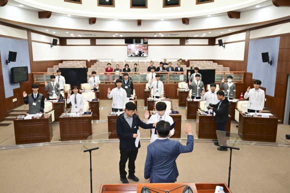 김천시의회(의장 나영민)는 11월 24일 의회 본회의장 3층에서 문성중학교 학생 26명을 대상으로 2025년도 청소년의회교실을 운영했다.