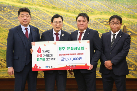 2025년 4월 16일, 경주시 문화청년회, 경주 청우회, 새마을부녀회는 경주시청을 방문하여 영남지역 산불 피해 이재민들을 돕기 위한 성금을 기탁했다.경주시 문화청년회는 경주문화고등학교 졸업생 동문들로 구성된 단체로, 지역사회에 선한 영향력을 미치기 위한 다양한 활동을 펼쳐오고 있다. 최근에는 중증장애인자립지원센터 및 예티주간보호센터를 방문해 도배 및 비가림막을 설치하는 등 복지시설 지원에도 많은 노력을 기울이고 있다.경주 청우회는 경주시 청년들 간의 소통과 자기역량개발, 우호증진 및 지역사회 발전을 목표로 2011년에 설립된 단체로, 약 60명의 회원들이 지속적인 봉사활동을 하고 있다. 특히 2023년에는 지역자활센터에 생필품을 전달하며 매년 연탄나눔 봉사활동을 하는 등 지역사회의 어려운 이웃들에게 큰 도움을 주고 있다.경주시 새마을부녀회는 새마을정신을 바탕으로 새마을 조직의 효율적인 관리와 운영을 통해 새마을 운동 활성화에 기여하고 있으며, 지역사회를 위한 다양한 봉사활동을 진행하고 있다.방인석 문화청년회 회장은 “산불 피해로 어려움을 겪고 있는 분들을 돕기 위해 기부하게 됐다. 우리의 나눔으로 조금이나마 힘이 됐으면 한다”고 밝혔다.박진환 경주 청우회 회장은 “지속적인 봉사활동을 통해 경주시 관내 이웃들에게 힘을 주었지만, 이번 산불 피해를 입은 이재민들에게도 도움이 되고자 기부행렬에 동참했다. 우리의 마음이 이재민들에게 잘 전달됐으면 좋겠다”고 말했다.정명숙 새마을부녀회 회장은 “산불 피해를 입은 이재민들에게 위로의 말씀을 전하며, 그들의 삶의 터전 복구에 우리의 성금이 도움이 되기를 바란다”고 전했다.주낙영 경주시장은 “많은 분들이 모아주신 성금이 이재민들에게 큰 힘이 될 것이라 생각한다. 성금을 모아주신 모든 분들께 감사드리며, 보내주신 성금은 이재민들의 삶의 터전 복구에 사용될 수 있도록 하겠다”고 전했다.